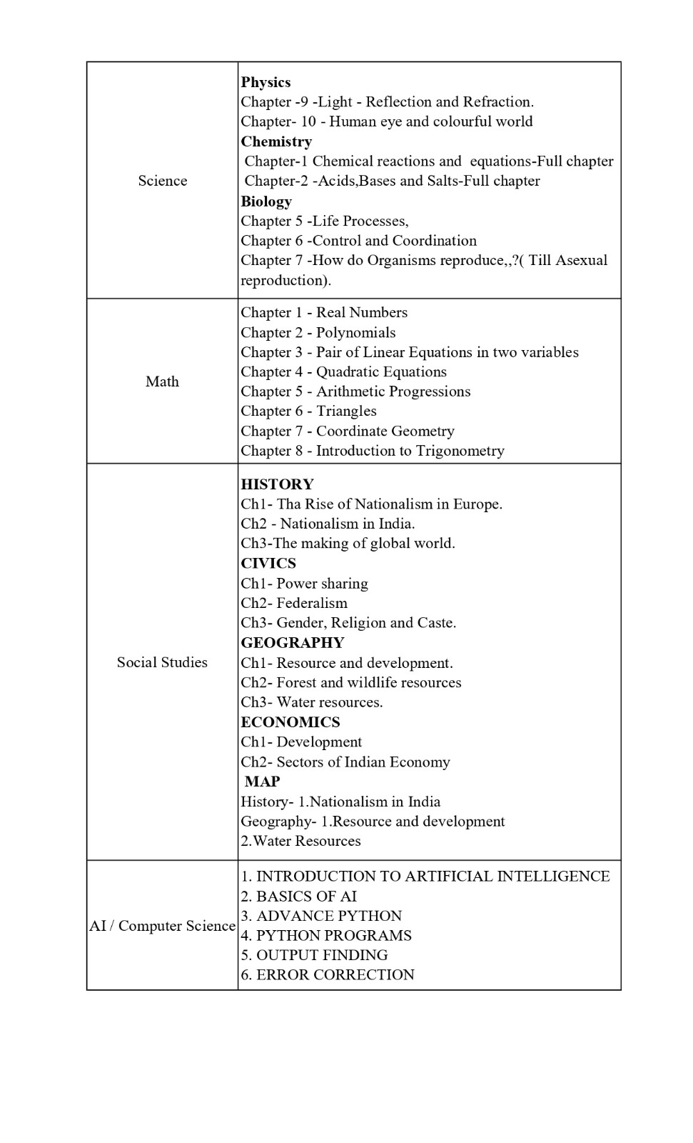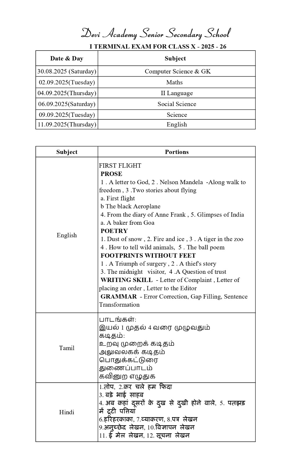 Time table and syllabus for Class 10 Term 1.