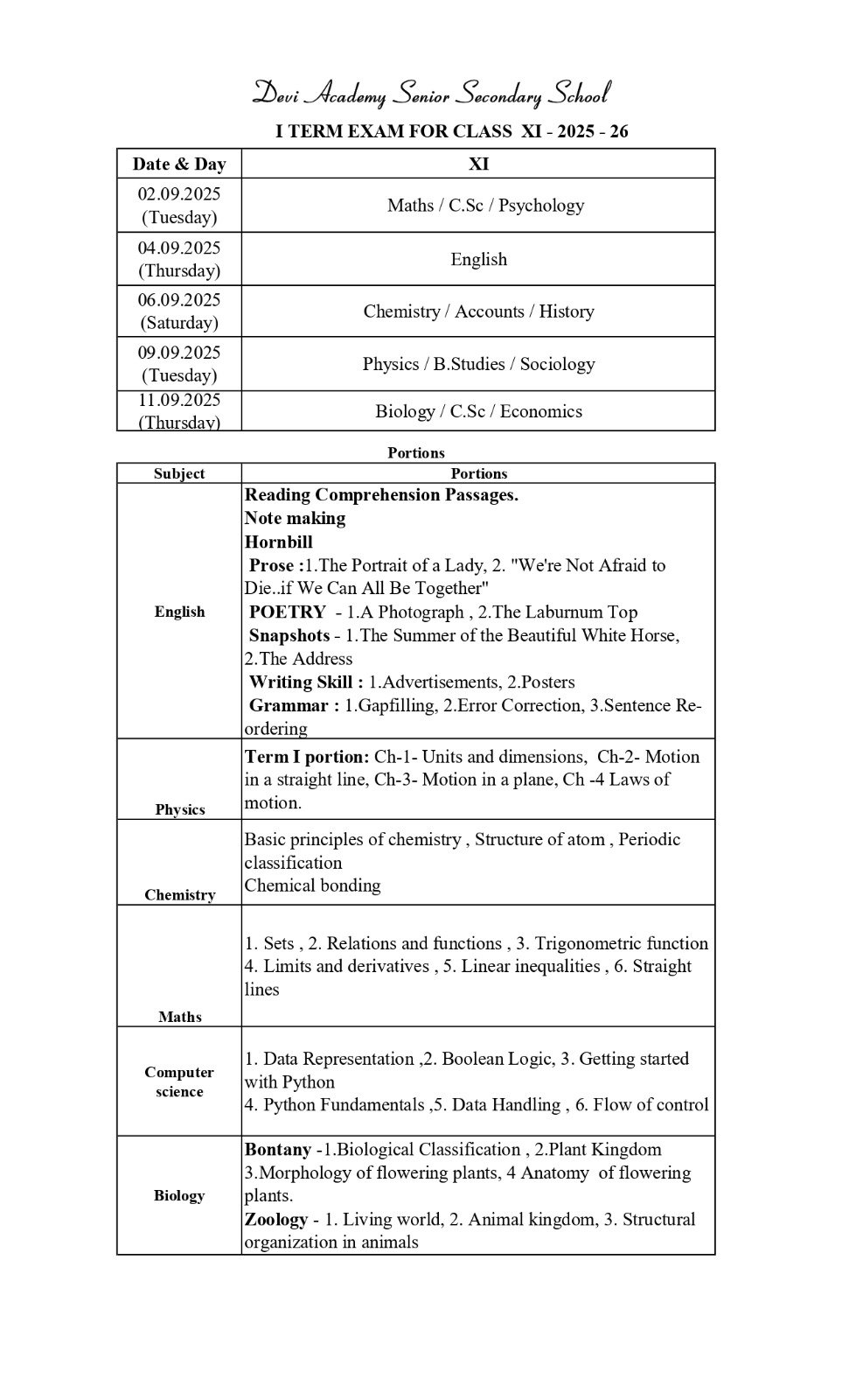 Time table and syllabus for Class 11 Term 1.