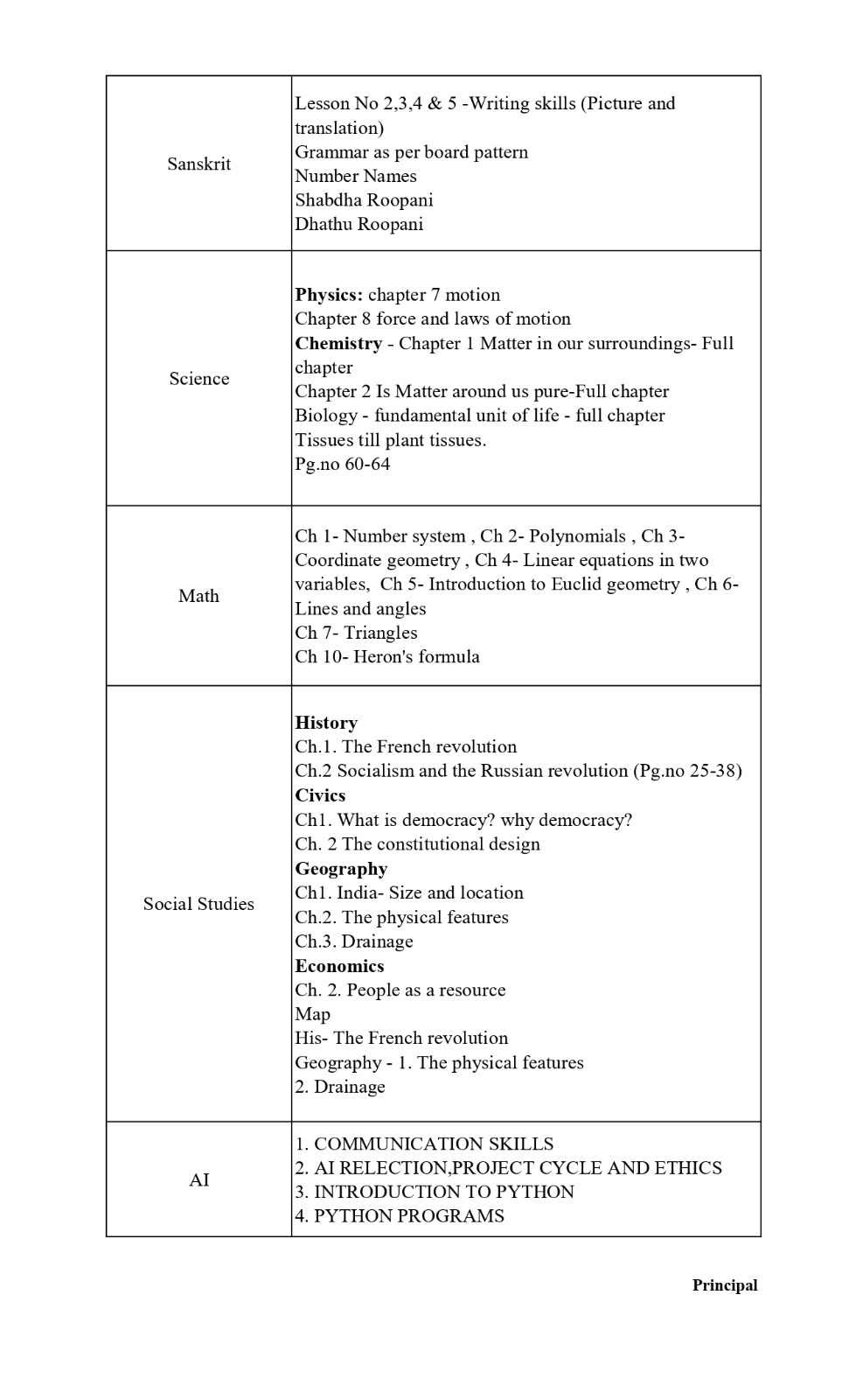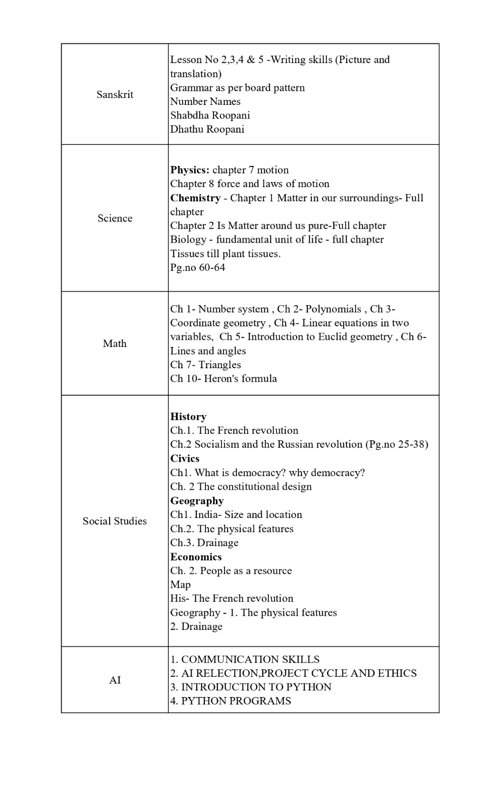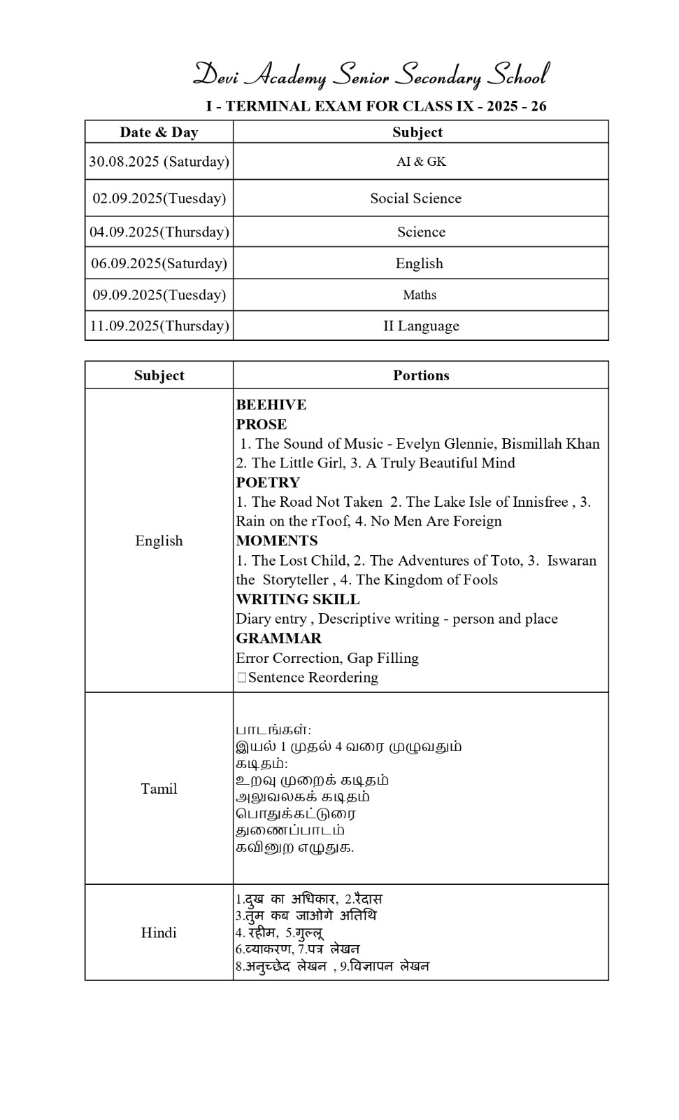 Time table and syllabus for Class 9 Term 1.