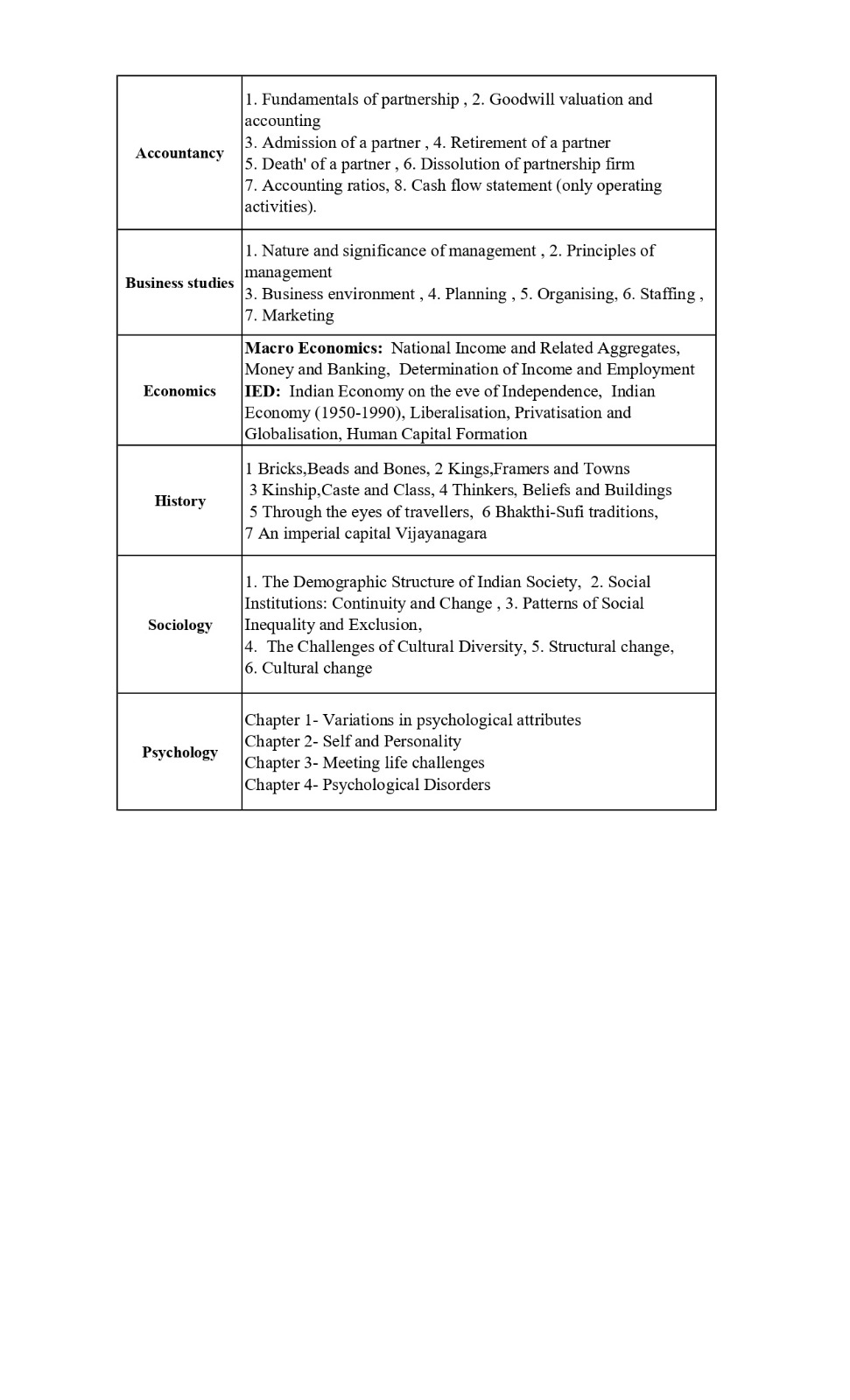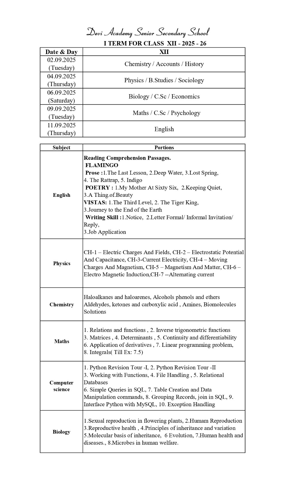 Time table and syllabus for Class 12 Term 1.