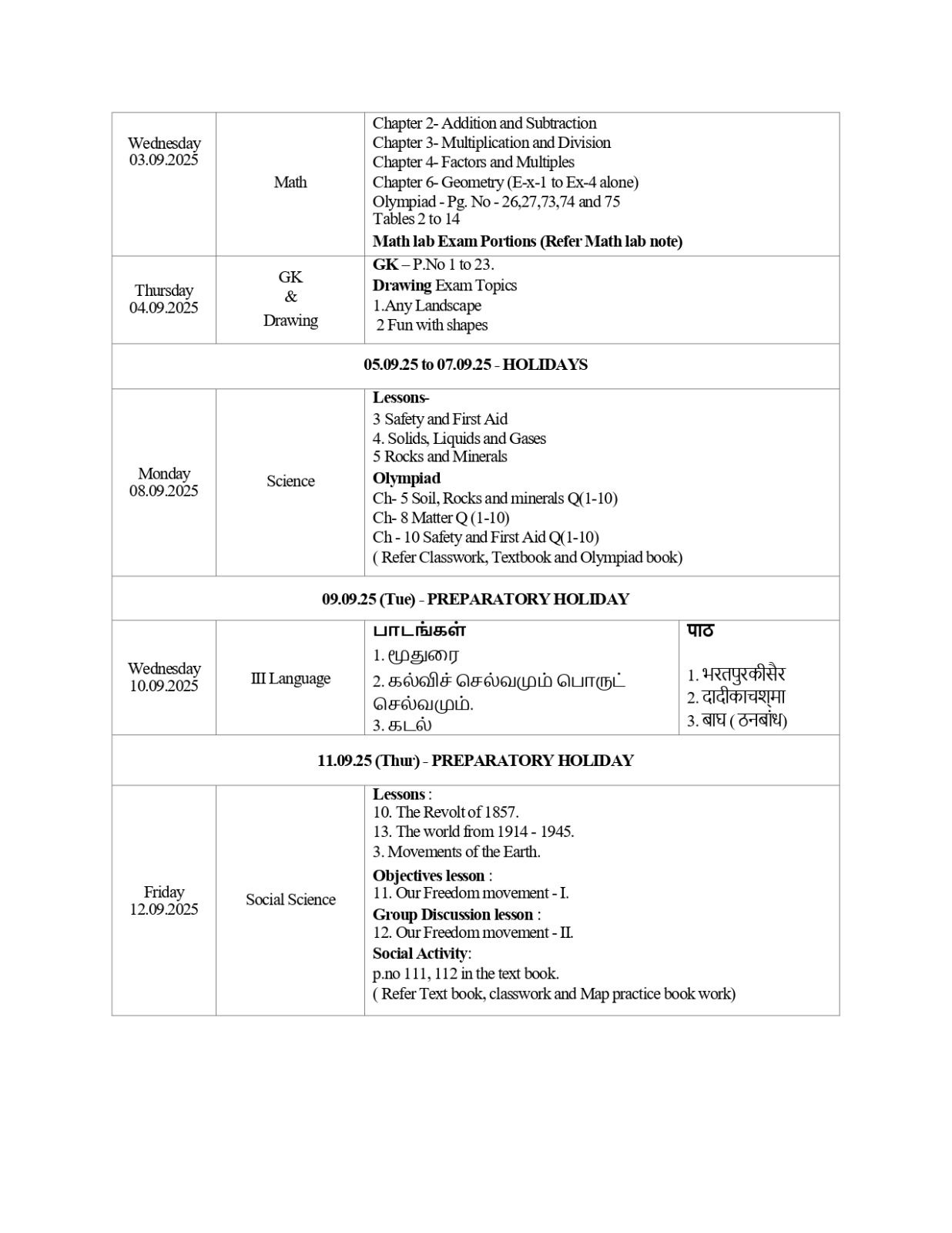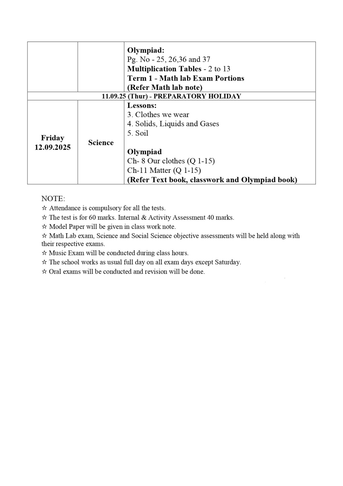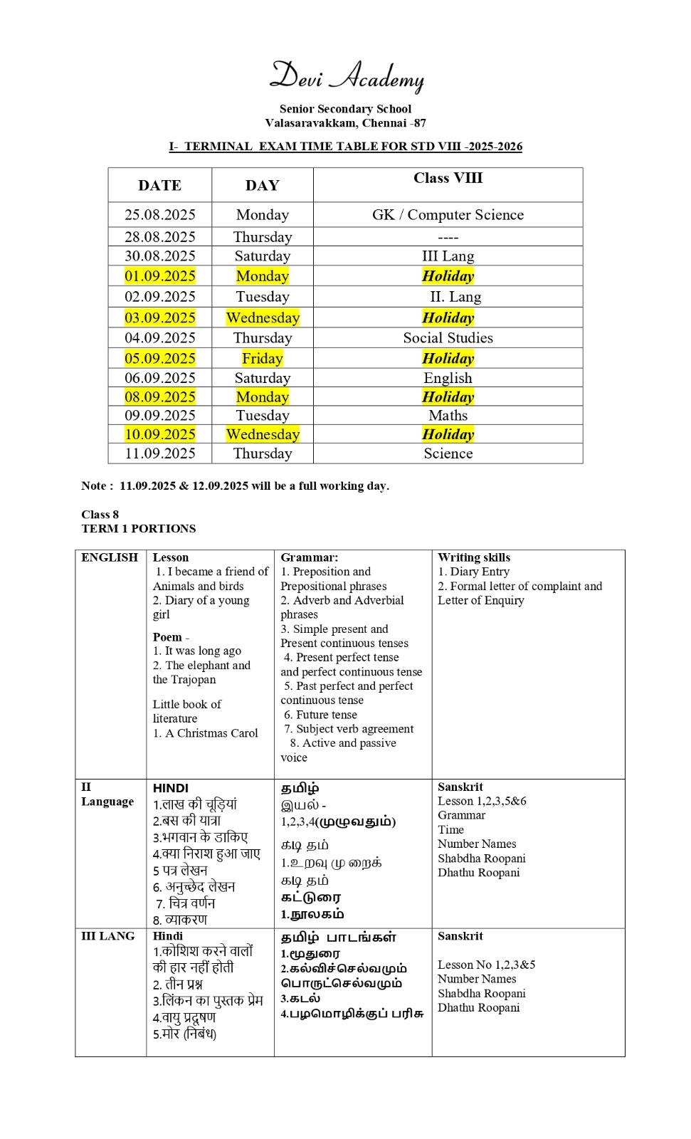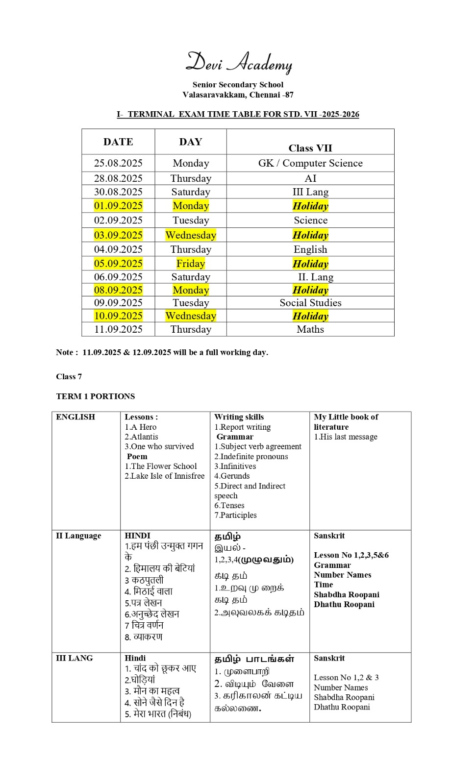 Time table and syllabus for Class 7 Term 1.