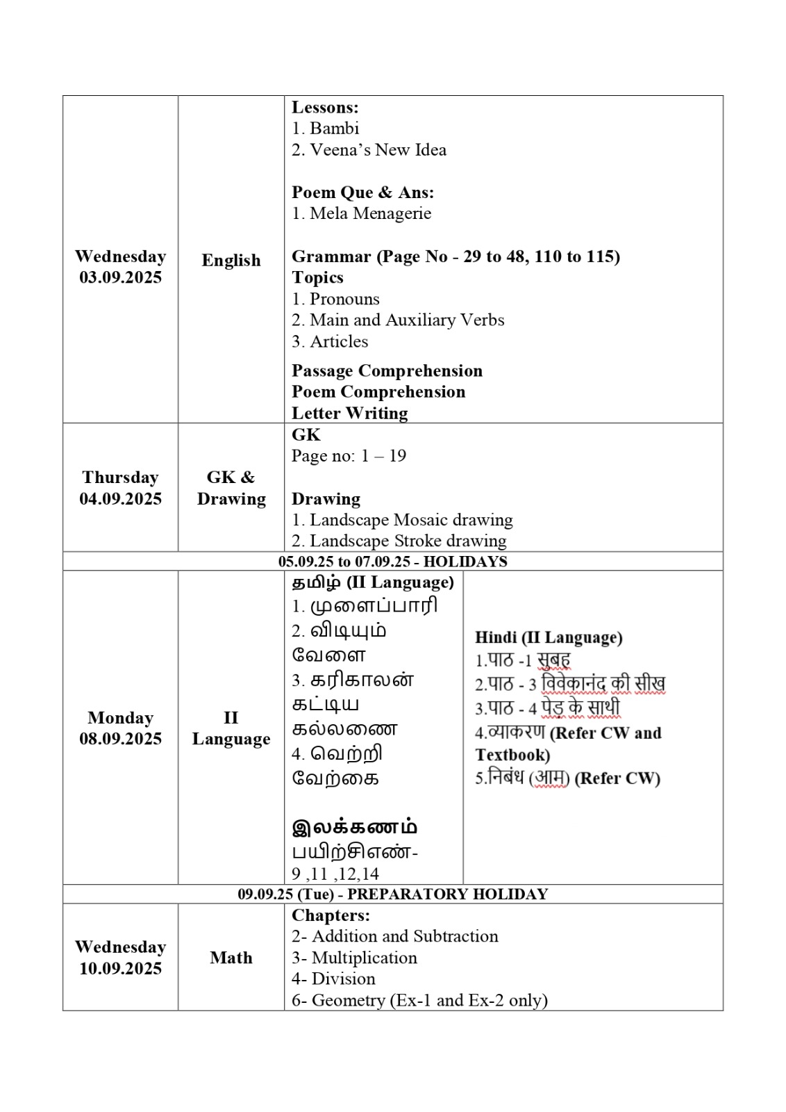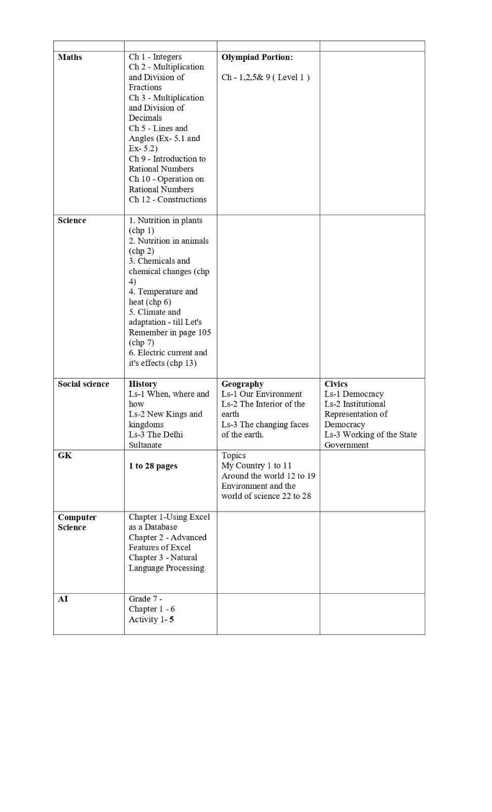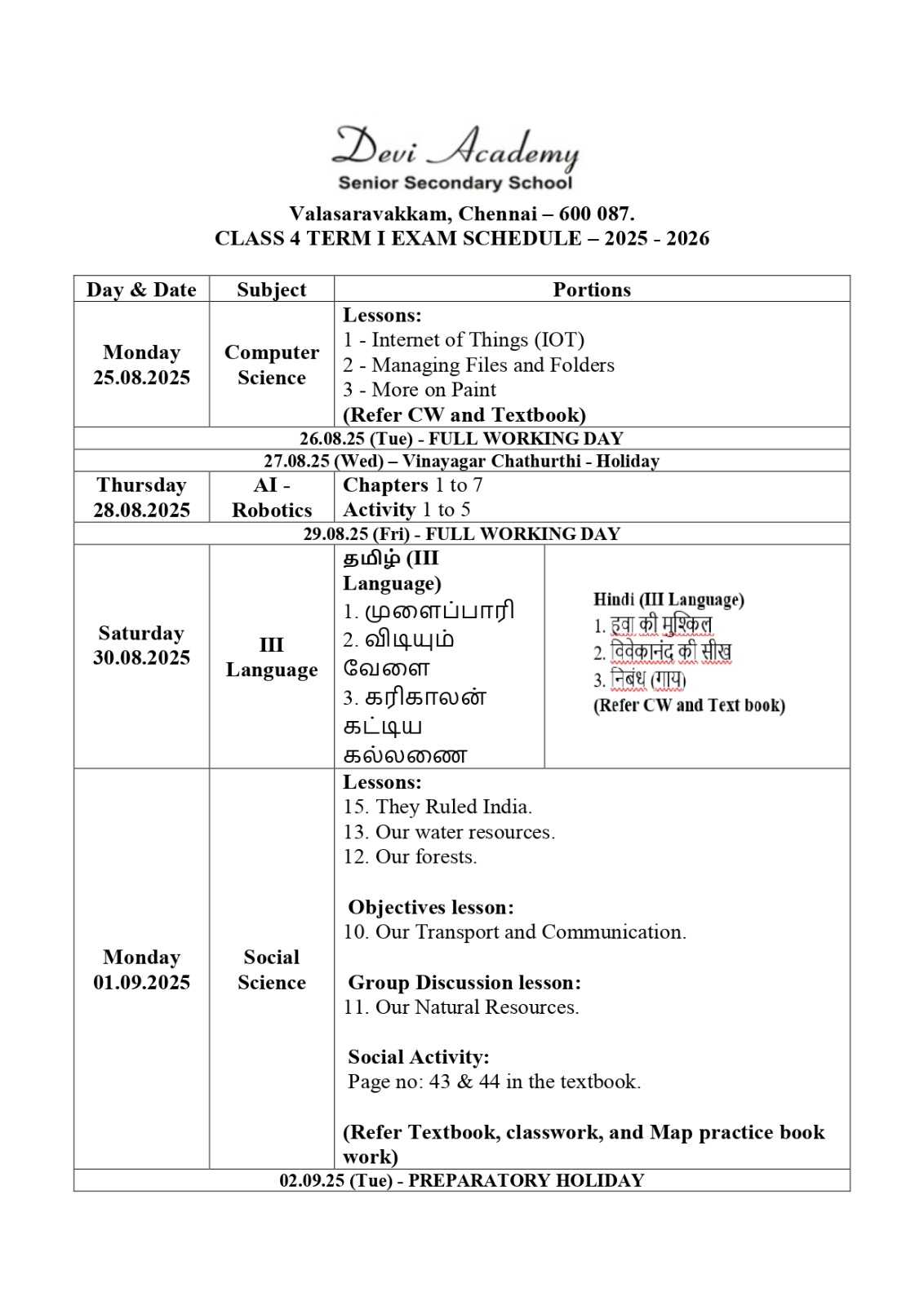 Time table and syllabus for Class 7 Term 1.