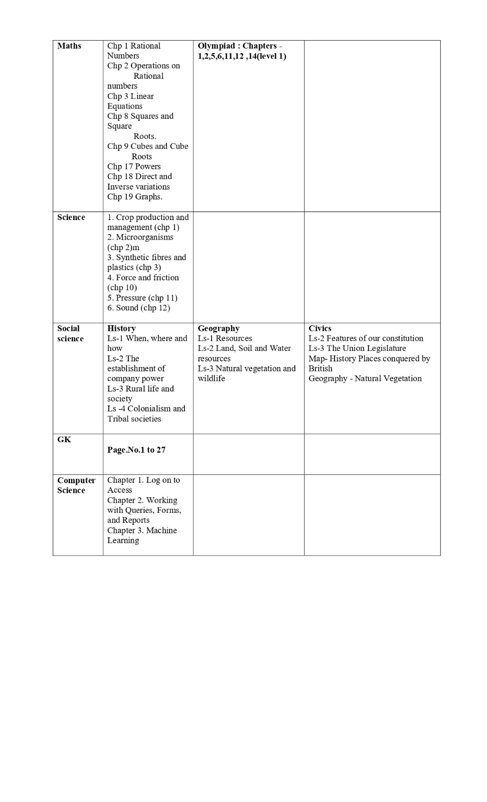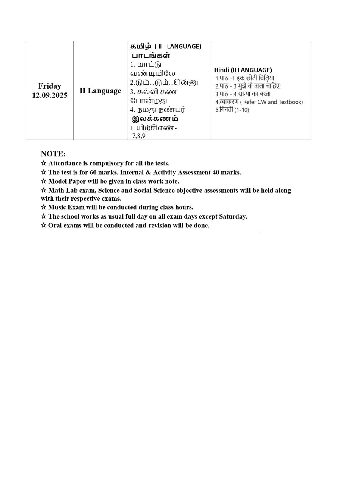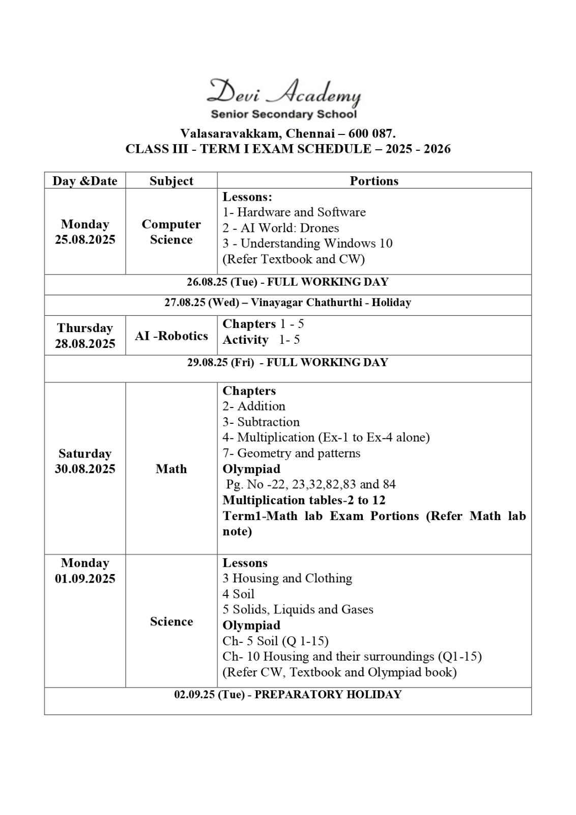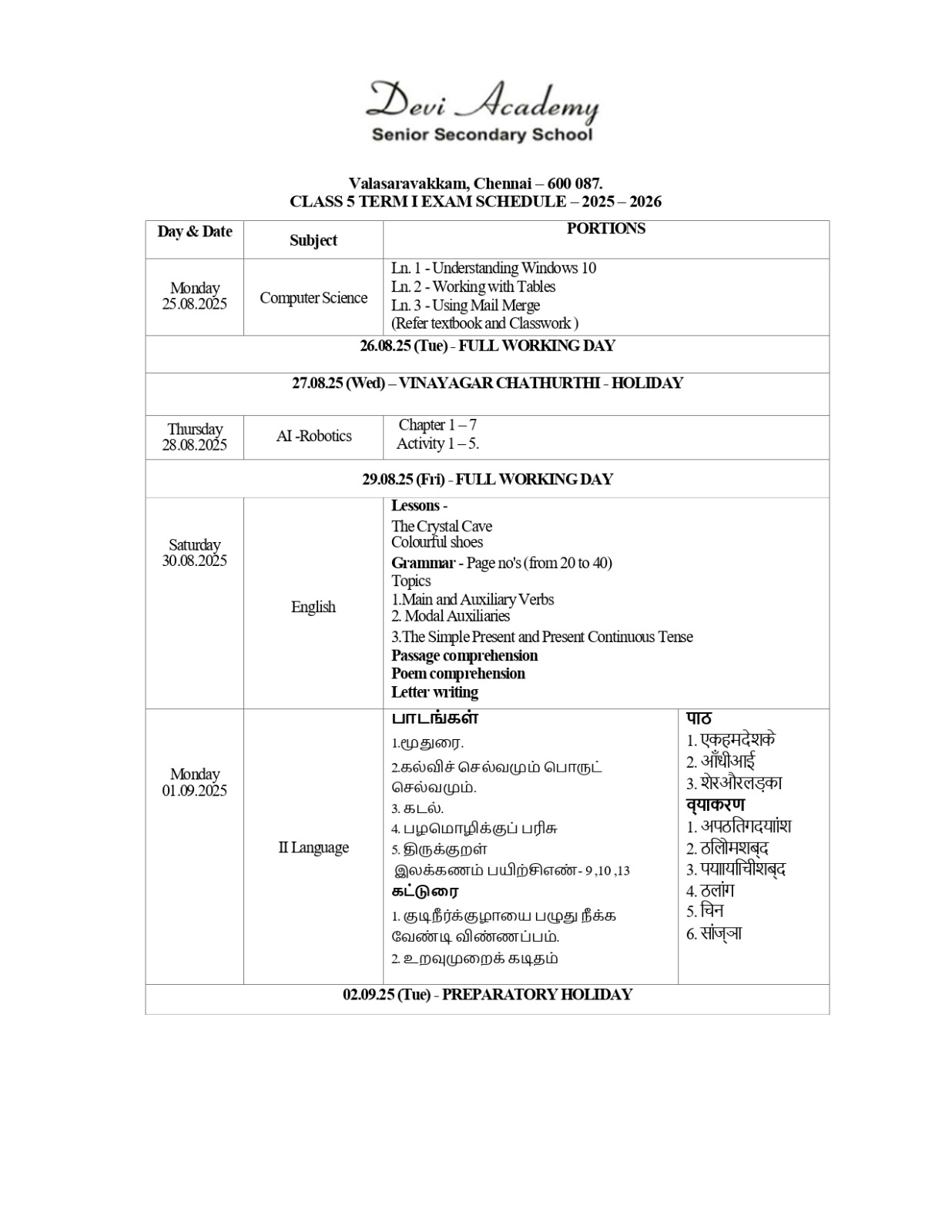 Time table and syllabus for Class 7 Term 1.