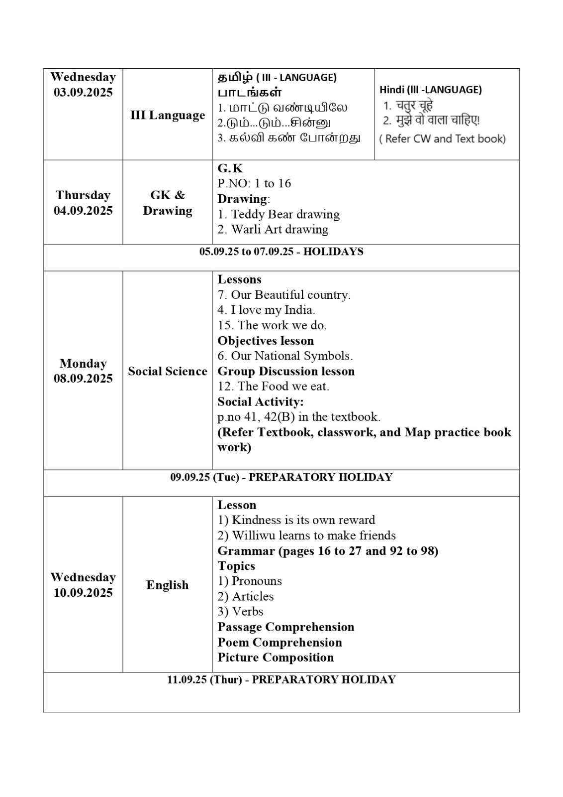 Time table and syllabus for Class 3 Term 1.