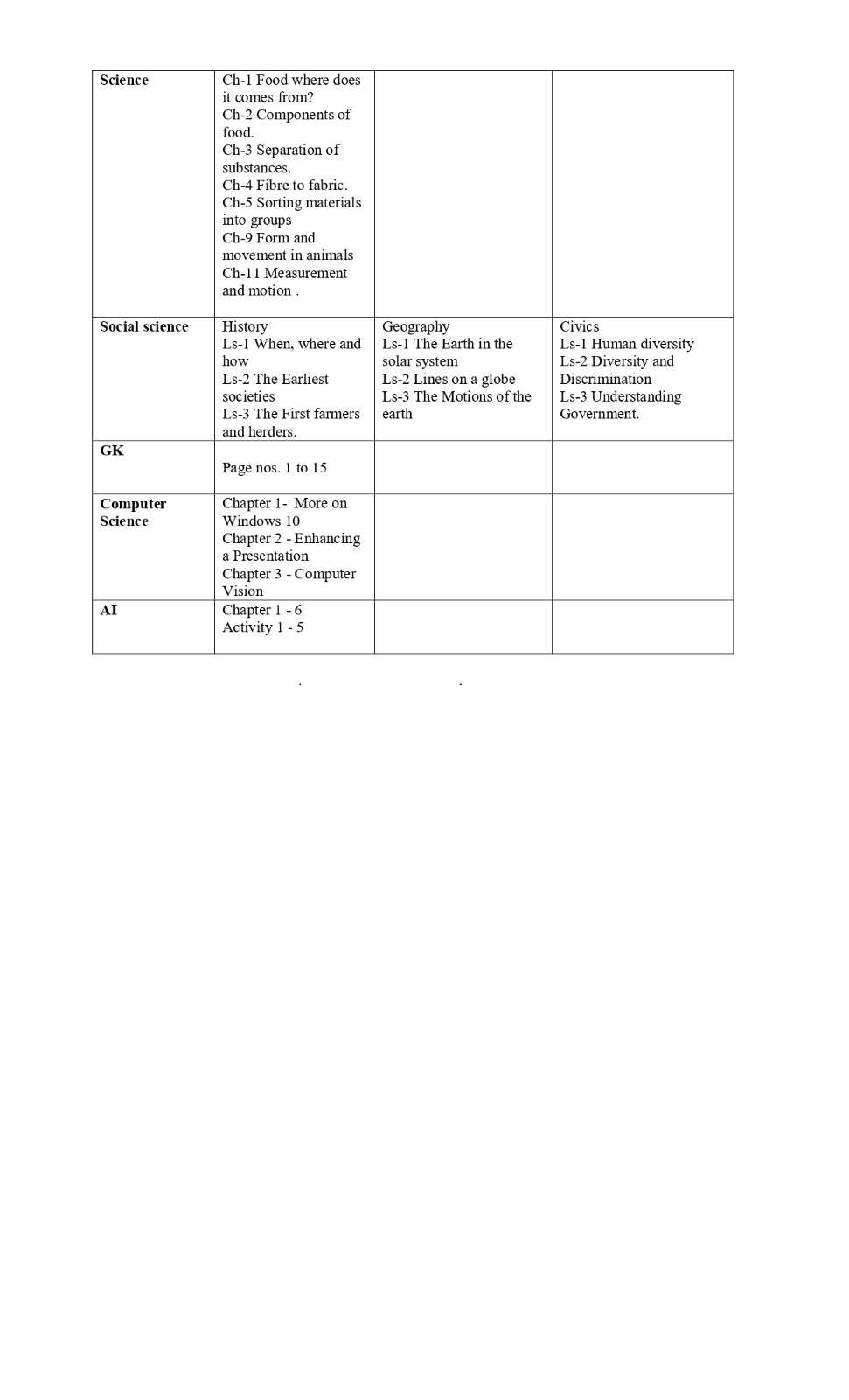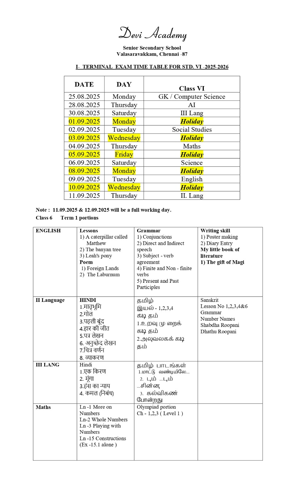 Time table and syllabus for Class 6 Term 1.