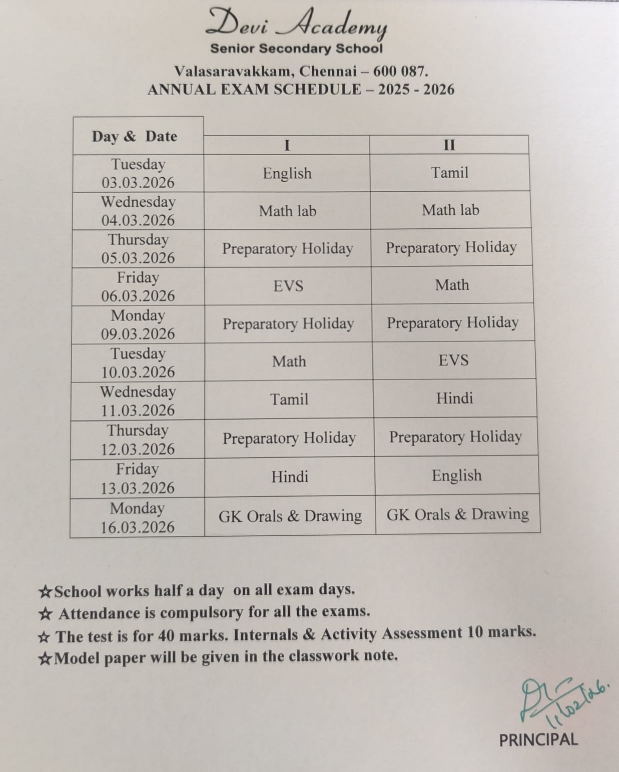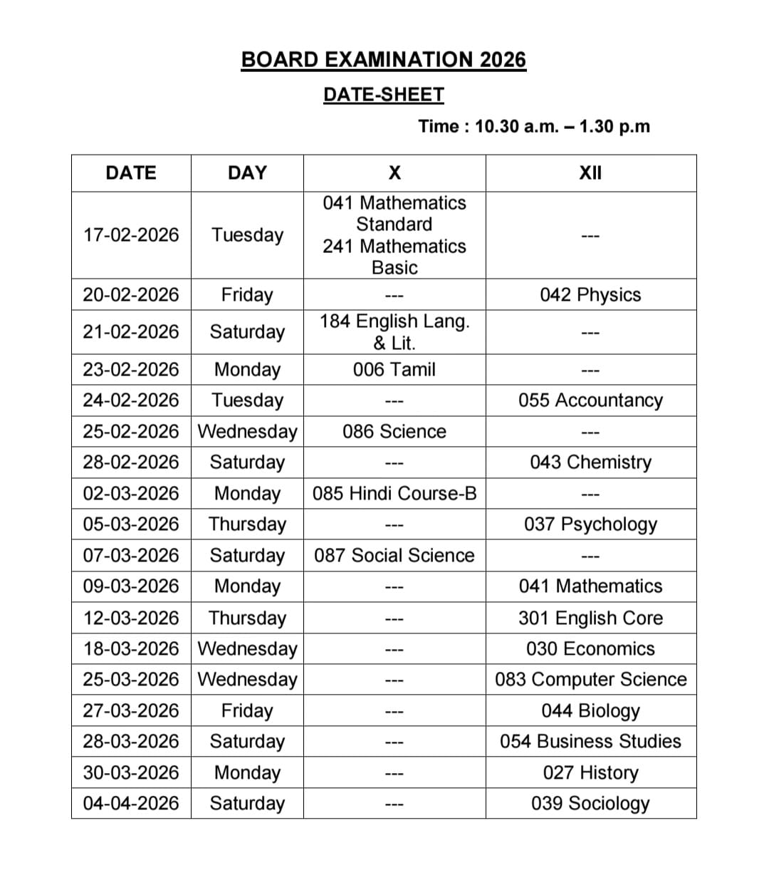 Official Board Examination Schedule for Classes X and XII. Students and parents are requested to carefully review the schedule.