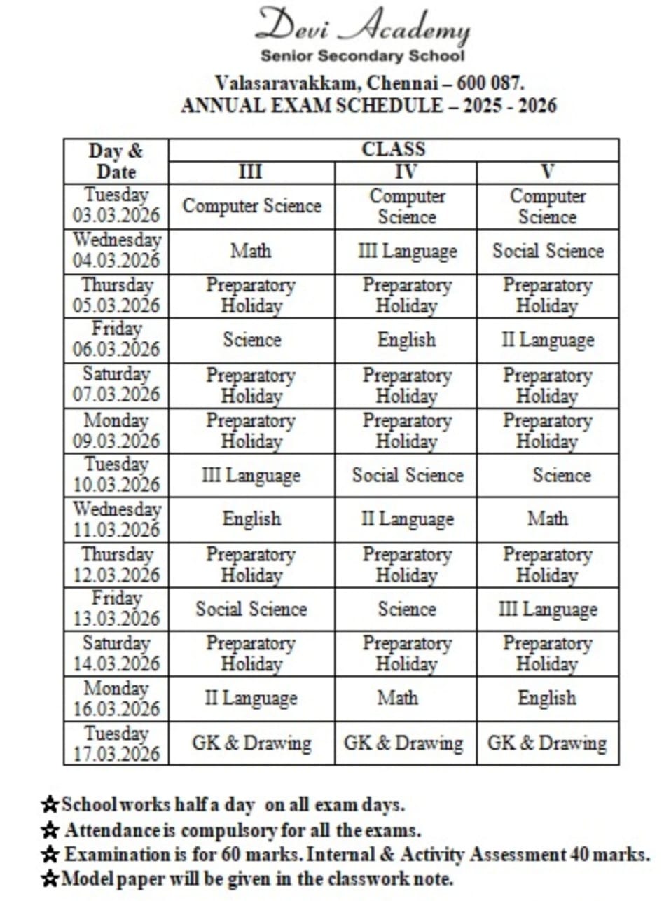 Annual Examination Time Table for Classes III, IV and V.