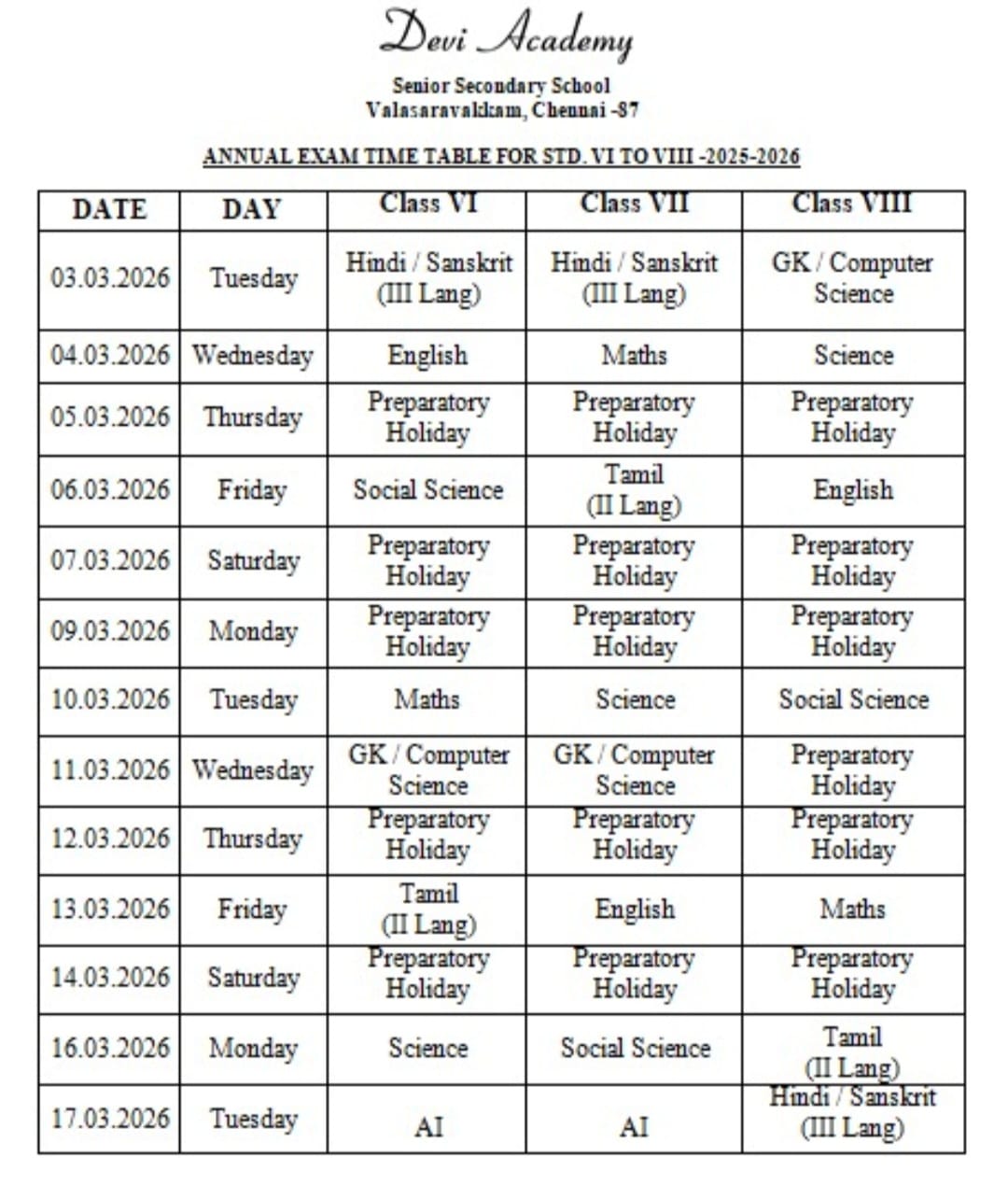 Annual Examination Time Table for Classes VI, VII and VIII.